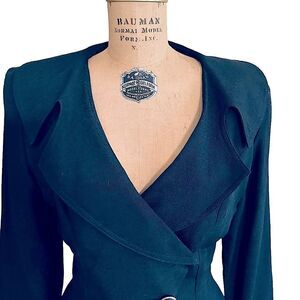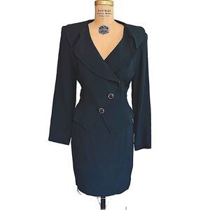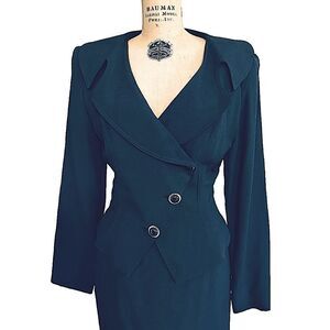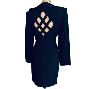 90s Vintage Nina K black crepe skirt suit. Asymetric short jacket has large lapels, 3 button fastening outside and inside button to hold the double breast in place with Sexy lattice cut out panel on back. Knee length skirt is straight, lined with kick pleat at back . Suit is well cut for a fitted shape. In excellent condition . Fabric is 70% Rayon and 30% Nylon. Made in USA