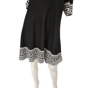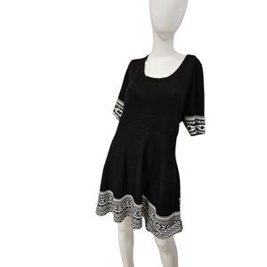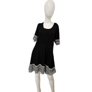 Elegant black midi dress with white patterned accents. Short sleeves. Perfect for any occasion.