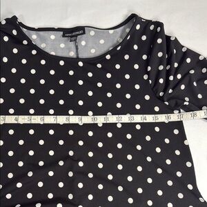Step out in style with this Nina Leonard dress, showcasing a striking black and white palette. The dress features a playful asymmetrical design with ruffled tiers, a scoop neckline, and 3/4 sleeves, perfect for a casual outing. Its A-line silhouette offers a flattering fit, making it a versatile addition to your wardrobe.