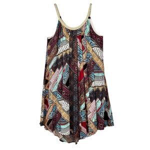 Channel effortless boho energy with this patchwork swing dress by Nina Leonard. Designed in a lightweight, gauzy rayon with a soft full lining, it features warm earth tones of brown, burgundy, cornflower blue, mustard, rust, and ivory. The scoop neckline is accented with braided metallic gold straps for a touch of shimmer and artisan flair. With a relaxed swing silhouette and curved hemline, it's the perfect festival, vacation, or artsy everyday piece.