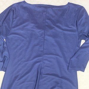 This soft knit is a classic minimalist chic dress with a simple large zipper for accent on the front. Scoop neck and elbow length sleeves. It widens at the hips for a flowy skirt. Easy to wear, comfy and machine washable. Great spring / summer dress