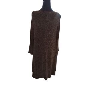 Nina Leonard black with gold sparkle, cold shoulder & bell sleeve knee length dress. Women's size medium. gently used no snags, rips or stains. See photos for measurements & material.
