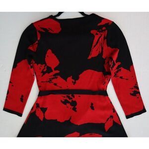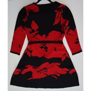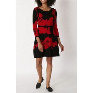 Nina Leonard Women's Sz S Red Floral Belted Jacquard Fit & Flare Sweater Dress