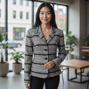 Stylish women's jacket featuring a classic black and white pattern. Perfect for adding a touch of elegance to any outfit. Approximate flat measurements; length 25”, armpit to armpit 19”, sleeve length 24.5”