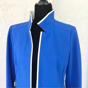 Striking royal blue jacket with white accents, open front, front slash pockets, cotton blend, measures U/A to U/A 18” and length is 22”, perfect condition.