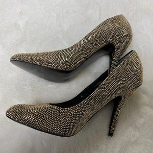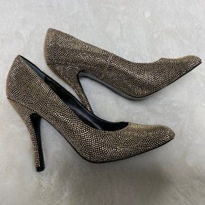 Gold metallic studs surround these size 7.5 high heeled pumps. These shoes are in like NEW condition and are constructed with quality in mind. The heel measures 4 inches. These shoes have leather soles and show no signs of having been worn except to try on.