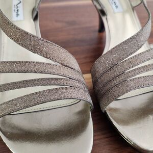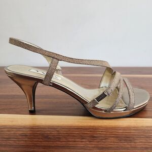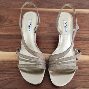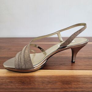 DETAILS: Nina Neely Heel Sandal Gold Glitter Asymmetrical Strap Slip On Party Shoe Size 9