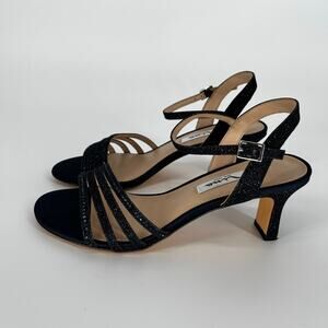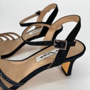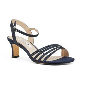 The Nina Nelena sandals in Navy Dreamland feature a shimmering strappy design with an elegant mid heel. Crafted with a composition leather sole and cushioned insole for comfort, these heels combine sophistication with ease. The ankle strap and open toe add a feminine touch, making them perfect for evening events, weddings, parties, or formal occasions. These shoes blend glamorous sparkle and timeless style, ideal for dressing up any look.