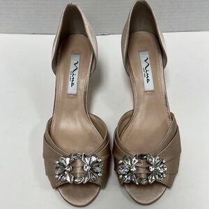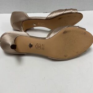 Nina New York Champagne Satin Open Toe Heels with Rhinestone Embellishment