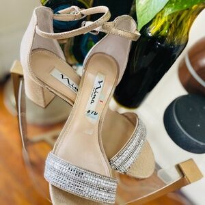These elegant Nina New York block heels, size 6.5, feature a sparkling gold finish with rhinestone detailing across the toes, perfect for adding a touch of glam to any outfit. The block heel provides comfortable support, ideal for weddings, formal events, or a night out. Barely worn, with minor signs of use on the soles, but in excellent condition on the exterior. Elevate your look with these stunning shoes!