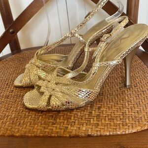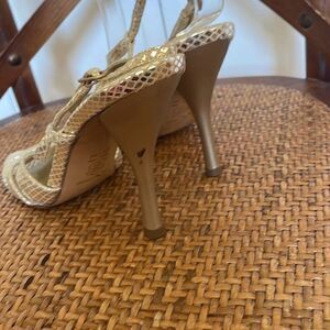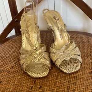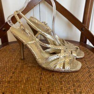 Description: beautiful crackled strappy sling back heels with adjustable buckle at ankle and 3” heel