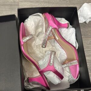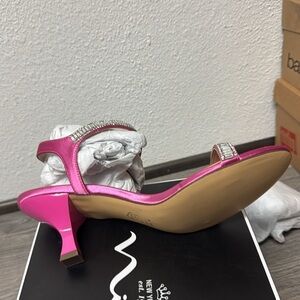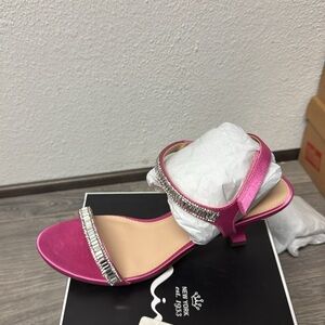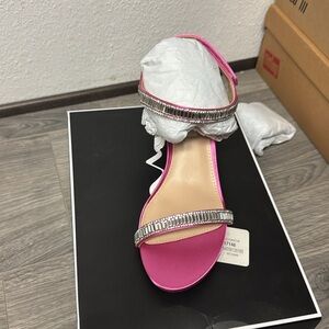 Dazzling baguette crystals illuminate the straps of this chic sandal anchored by a lacquered heel. Rear-velcro quarter-strap allows the baguettes to shine uninterrupted and makes for easy entry.