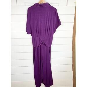 Features: Purple, Collared, Button-down front, Short sleeves, Front tie waist, below knee length, Draped hem, Jersey knit material