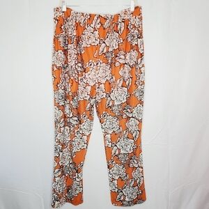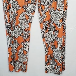 Nina Parker Floral Wide Leg Pants Size 3X Stretch Pull-on Lightweight. Colorful lightweight pants in a deep orange color with white flowers trimmed in brown.