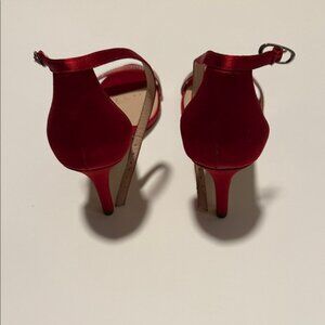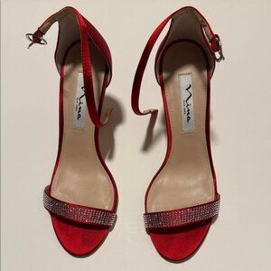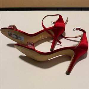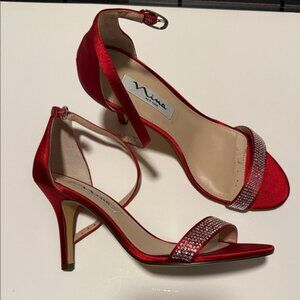 Elegant red satin heels by Nina. Features a sparkling rhinestone strap. Perfect for evening wear.