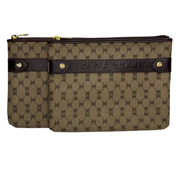 Nina Ricci Beige Brown Monogram Clutch Makeup Travel Bag Set of 2 Zipper Closure