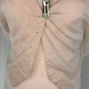 Off-white cotton-linen blend (54% Cotton, 46% Linen) with acetate-viscose lining (74% Acetate, 26% Viscose). Jacket. Sleeveless. Front button closure. 16.5" from shoulder to hemline. Imported.