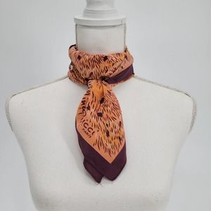Nina Ricci Paris silk square scarf. Coral tan and cream animal print with plum accents and boarder. Preowned and in good condition, small spots on corner (pictures shown).