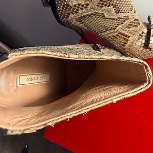Nina Ricci bow accent snake skin, high heel booties.