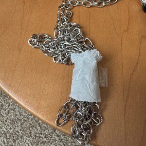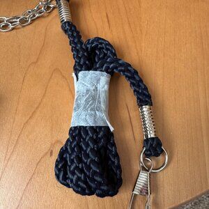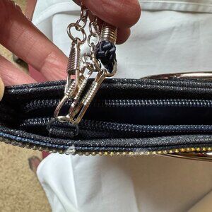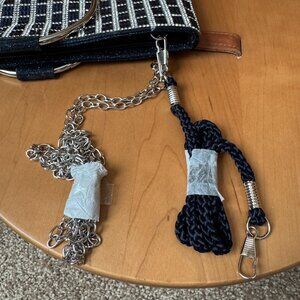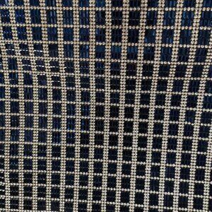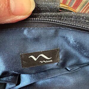 Nina; Sandia Evening Bag; Blue & Diamond Crystals; Embellished Bag;; Double Silver Ring Handle; Front: Round Diamond Rhinestones & Oblong Blue Rhinestones set in tight rectangular pattern; Back: Blue Sparkles; Added Removeable Crossbody Options: Silver Chain & Navy Blue Silk Rope (Unopened); Top Zipper Close; Ring Handles 4"Drop; Navy Blue Satin Lining; No signs of use or wear; 9.25"L x 0.5"W x 7.75"H