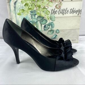Nina Satin Ruffle Peep Toe Heels Black 8.5