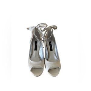 Nina satin wedge shoe. Beautiful elegant shoe in ivory. Satin upper with round open toe with ankle strap bow. 4” heel. Worn only one time, perfect condition. Size 8