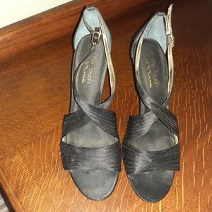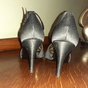 Has an adjustable strap. Heel is 3 and 1/2". Leather sole. Upper is, folded silk.