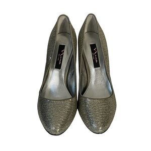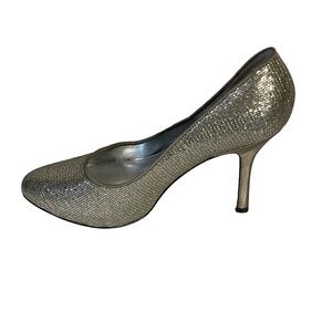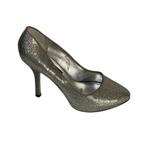 Nina Silver Glitter Fabric Leather Sole Stiletto Heel Slip On Pump Shoe Sz 8