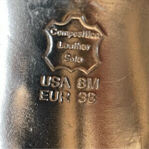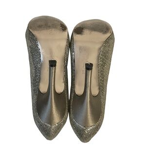 Silver glitter material with solid silver/pewter satin heels. Approx heel height 4 inches. Lovely condition with some faint scuffs on one heel and slight peeling inside.