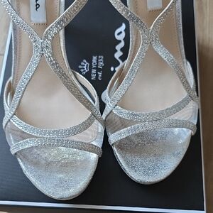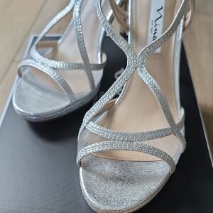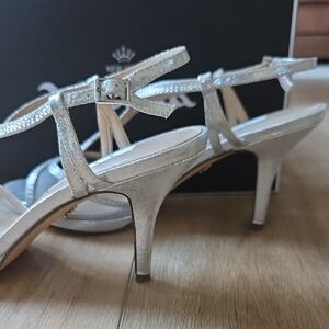 Elegant silver heels with glittery straps. Perfect for evening wear.