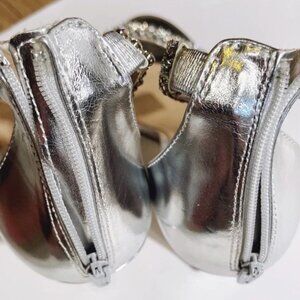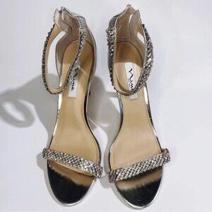 Nina Vauna Grey Metallic Foil Ankle-Strap Mid-Heel Evening Sandals | Size 9.5