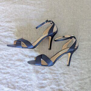 Nina Venus Satin Heeled Sandals with Ankle Strap in Navy Blue Luster Size 9.5