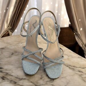 Chic silver sandals with sparkling rhinestone straps. Ideal for glamorous events.