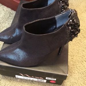 Nina black leather booties. Beaded back and heel with back zipper. Size 7 1/2. 4” heel. Worn only a few times. Great condition.