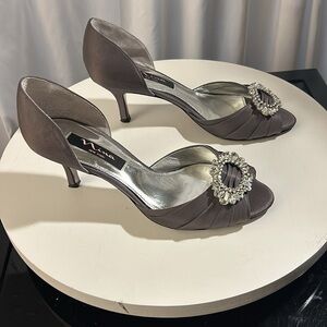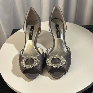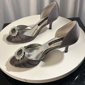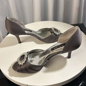 You are going to love these Nina d'Orsay Peep Toe Pumps in Size 8! Comfortable 2-1/2" kitten heel and a satin gray fabric upper add glamour to any outfit, from jeans to chiffon! Sparkling rhinestones and shimmering satin, and the rhinestone brooch embellishment and pleating details at the toe cap make these shoes a true statement piece. Worn only once to a wedding, here is your chance to own these vintage-inspired Nina d'Orsay Peep Toe Pumps! Check out my closet for more trendy and vintage items!