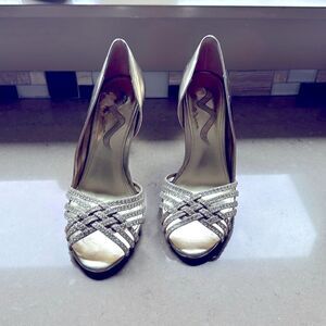 Nina heels, Gold with rhinestones, perfect for festive event. Size 9. Good condition!