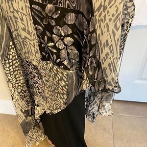 Nina Austin beautiful mixed in animal print black , white , and silver long dress with intricate beading all the way around under bust area . Adjustable thin silky straps and hidden zipper in the back. Built in bra cups and fully lined light chiffon material. Can be dressed up or down perfect for any occasion. Modeled on 5’5” with no heels.