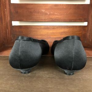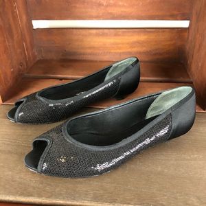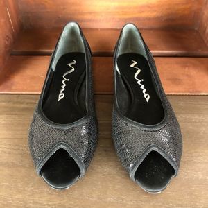 Black kitten heels, covered in black sequins, with peep toes. Perfect to wear for a wedding for a mother of the bride or wedding party who doesn’t want to wear uncomfortable heels. 3/4” heel. No flaws, very minimal signs of wear.