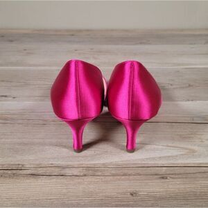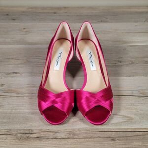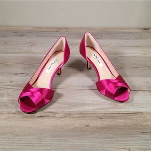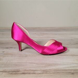 These fuchsia open-toe pumps from Nina New York have d'Orsay curves, kitten heels and satin crisscross over the vamp. Slip-on with almond toes.