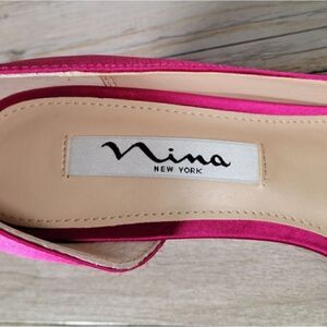 These fuchsia open-toe pumps from Nina New York have d'Orsay curves, kitten heels and satin crisscross over the vamp. Slip-on with almond toes.