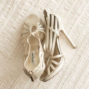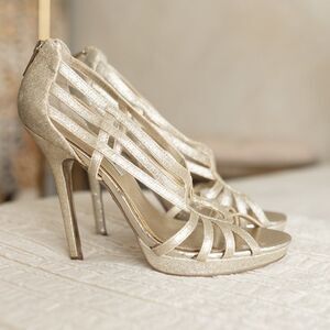 Glitter gold heels. Pre-owned condition with normal wear. See Images for marks along inner left shoe and rear of right shoe. Back zipper. Perfect for a holiday party or new year's eve! Please see video for most accurate color/condition representation. Pet friendly, smoke free home.
