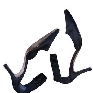 Black satin ankle strap evening heels. Rhinestone design on strap. Point toe. 3.5” heel. Genuine leather sole. Size: 7.5M. Preowned in good condition.