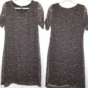 Nina Leonard Black Netted Button Embellished Shift Dress