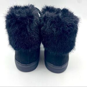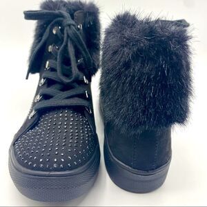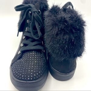Girls' black suede sneakers with bedazzled embellishments throughout, rubber soles, faux fur featuring lace-up accent at uppers and zip closure at side.