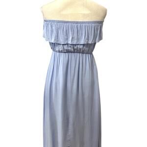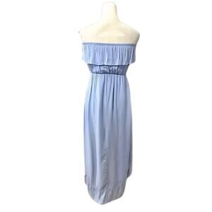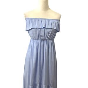 Elevate your style with this Nine Bird women's A-line dress in a stunning blue color. Featuring an off-shoulder, strapless design with a ruffled neckline, this dress exudes effortless elegance. The high-low hemline adds a trendy touch, making it a perfect choice for casual outings, summer events, or beach getaways. Made from lightweight rayon material, this midi dress ensures all-day comfort without compromising on style.