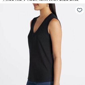 This stylish black tank top from Nine Britton features a ribbed texture and a classic V-neckline. The sleeveless design and cleanly finished armholes offer a comfortable fit, making it a versatile addition to any wardrobe.