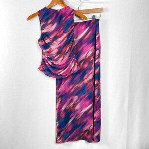 Fitted matching sleeveless ruched tank and skirt in a pretty abstract print.