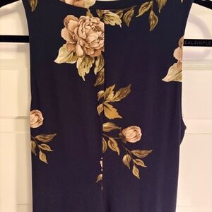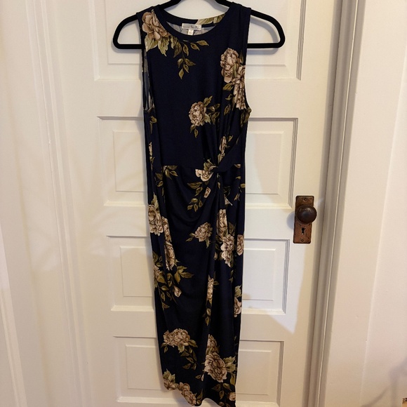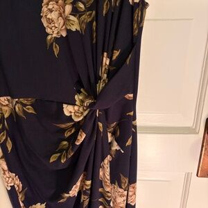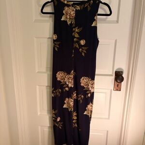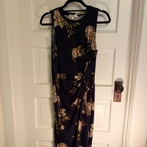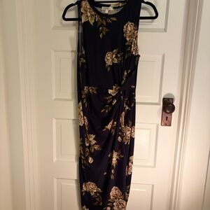 Very soft, tight-fitting polyester and spandex patterned dressing with ruching at the waist. Tank top. This dress is super comfortable and easy to wear. I've worn it 20 times so it's used, but in great condition. No stains, tears, or discoloration.
