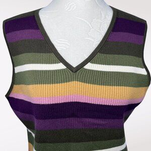 Retro ribbed cotton sweater vest in deep olive with purple, gold, pink, and cream stripes. Soft stretch knit with classic early-2000s Nine & Co. color story; easy to layer or wear solo.