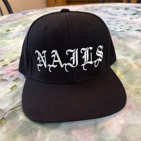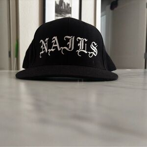 Black hat with “NAILS” embroidered on front. Adjustable. Never worn & excellent condition!
